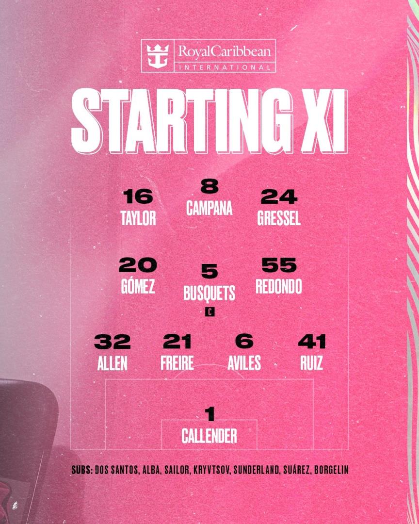 迈阿密国际首发:1-卡伦德、21-弗莱雷、6-阿维莱斯、32-阿伦、41-鲁伊斯、20-戈麦斯、5-布斯克茨、55-小雷东多、16-泰勒、24-格雷塞尔、8-坎帕纳