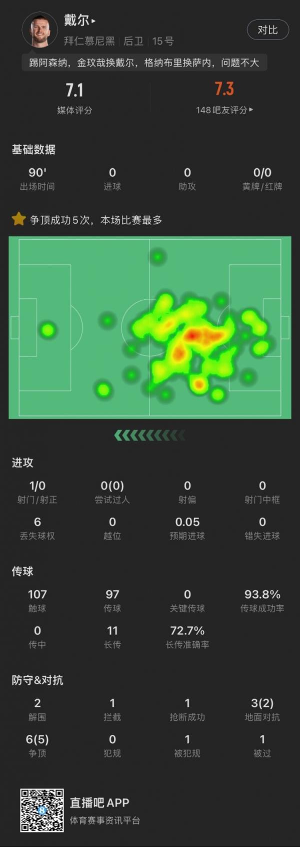 3月17日讯 德甲第26轮,拜仁客场5-2击败达姆施塔特。本场比赛,戴尔打满全场,获评Sofascore7.1分,并列全场首发球员中第四高。