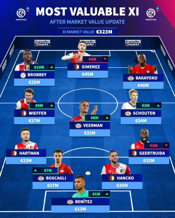 3月19日讯 今日德转市场更新了荷甲球员身价,列出了荷甲身价最高阵容。