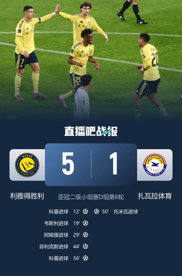 12月25日讯 亚冠二级联赛D组末轮,利雅得胜利5-1大胜扎瓦拉体育。至此,本小组的所有比赛已经全部结束。