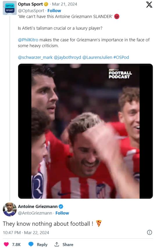 格列兹曼在社交媒体上进行了回击,他写道:“他们简直就是球盲!