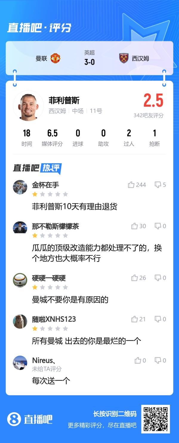 英超第23轮,曼联3-0完胜西汉姆联。从曼城租借加盟西汉姆的后腰菲利普斯再次送礼,直接导致球队丢掉第三球。吧友为他打分2.5。