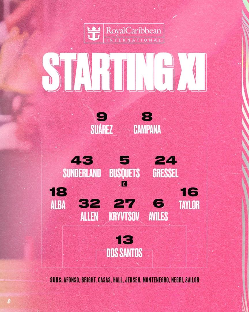 迈阿密国际首发:13-多斯桑托斯、6-阿维莱斯、32-阿伦、27-克里夫索夫、18-阿尔巴、16-泰勒、43-桑德兰德、5-布斯克茨、24-格雷塞尔、8-坎帕纳、9-苏亚雷斯