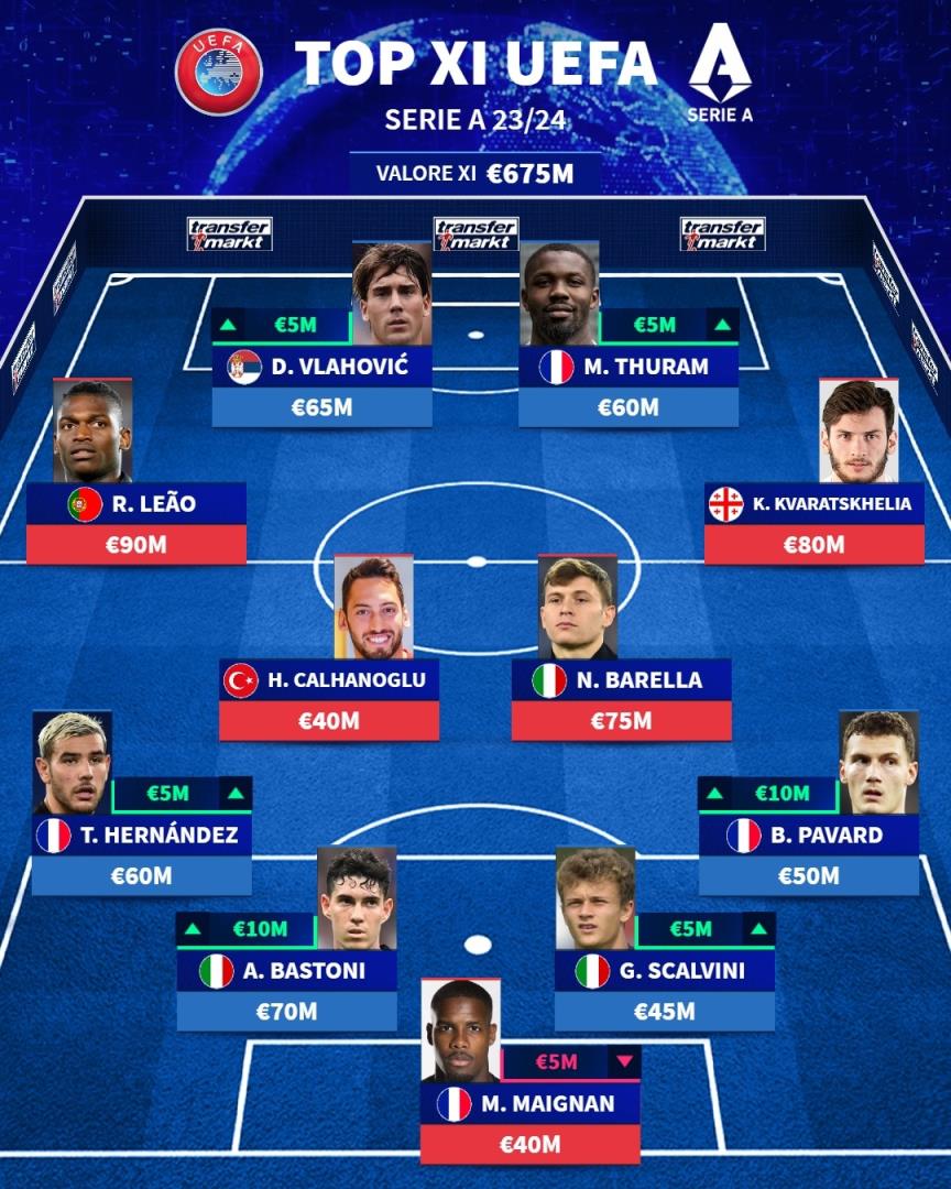 中场:恰尔汗奥卢(国米,土耳其,4000万欧)、巴雷拉(国米,意大利,7500万欧)、克瓦拉茨赫利亚(那不勒斯,格鲁吉亚,8000万欧)、莱奥(米兰,葡萄牙,9000万欧)