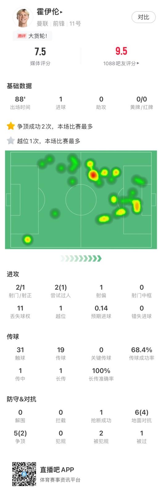 2月5日讯 英超第23轮,曼联3-0击败西汉姆,迎来21岁生日的霍伊伦连续4场破门,他出战88分钟,赛后获评7.5分。