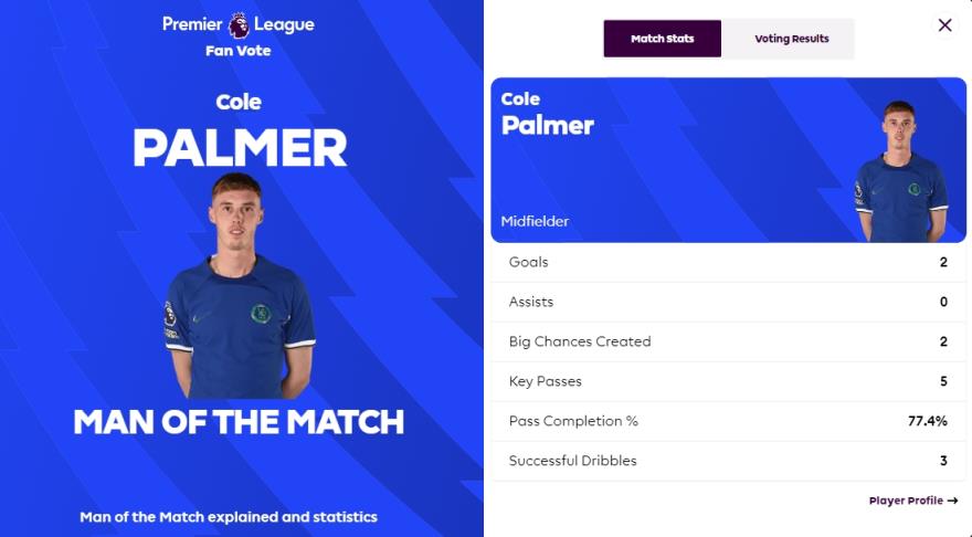 本场比赛中,帕尔默9次射门、4次射正便完成双响。他尝试过人3次全部成功,还送出了5脚关键传球。