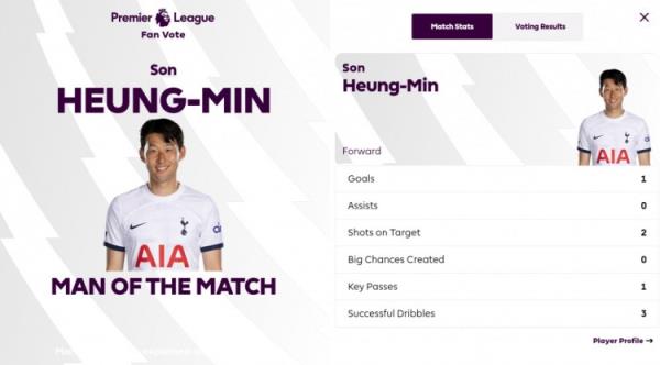 3月31日讯 英超第30轮,热刺主场2-1逆转击败卢顿,孙兴慜在第86分钟打进绝杀制胜球。赛后,他也获得了球迷80.4%的投票,以绝对优势当选全场最佳球员。