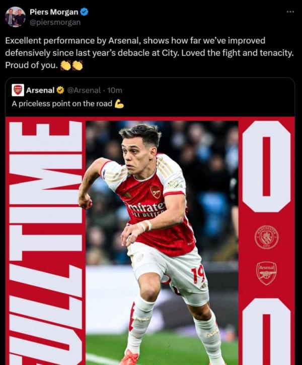 4月1日讯 在刚刚结束的英超争冠大战中,阿森纳客场0-0逼平曼城。赛后,知名阿森纳球迷、英国名嘴皮尔斯-摩根更新动态,称赞了球队的表现。