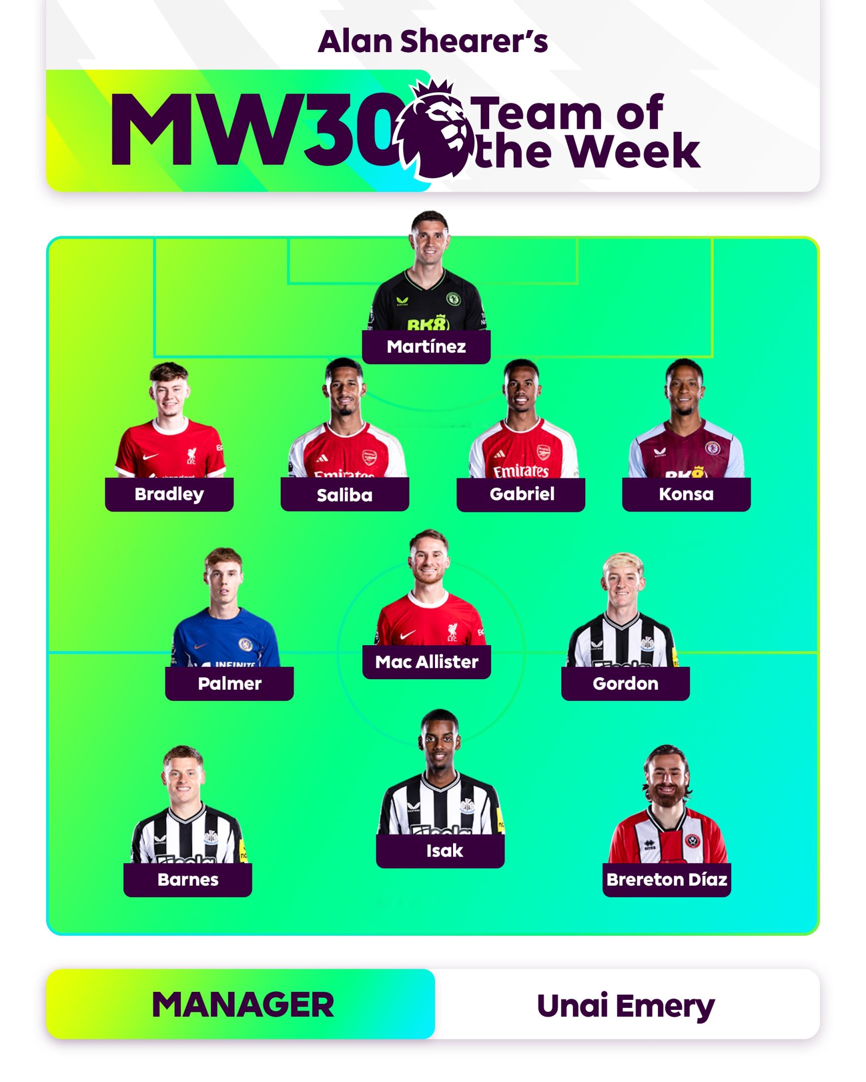中场:帕尔默(切尔西)、麦卡利斯特(利物浦)、戈登(纽卡斯尔)