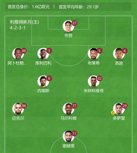 利雅得新月首发:37-布努、3-库利巴利、5-布莱希、66-阿卜杜勒哈米德、6-洛迪、8-鲁本-内维斯、22-米林科维奇、11-谢赫里、29-萨勒姆-多萨里、77-马尔科姆、96-迈克尔