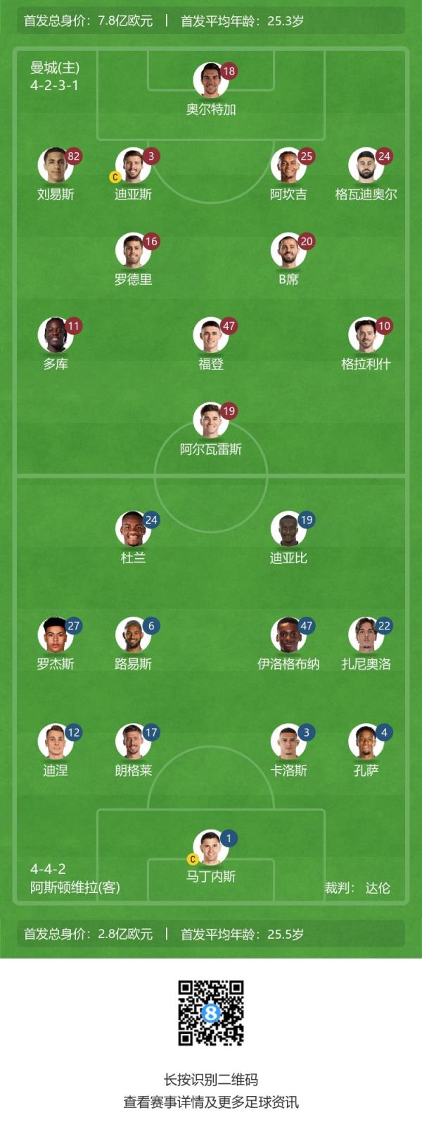 曼城首发:18-奥尔特加、82-刘易斯、25-阿坎吉、3-迪亚斯、24-格瓦迪奥尔、16-罗德里、20-B席、11-多库、47-福登、10-格拉利什、19-阿尔瓦雷斯