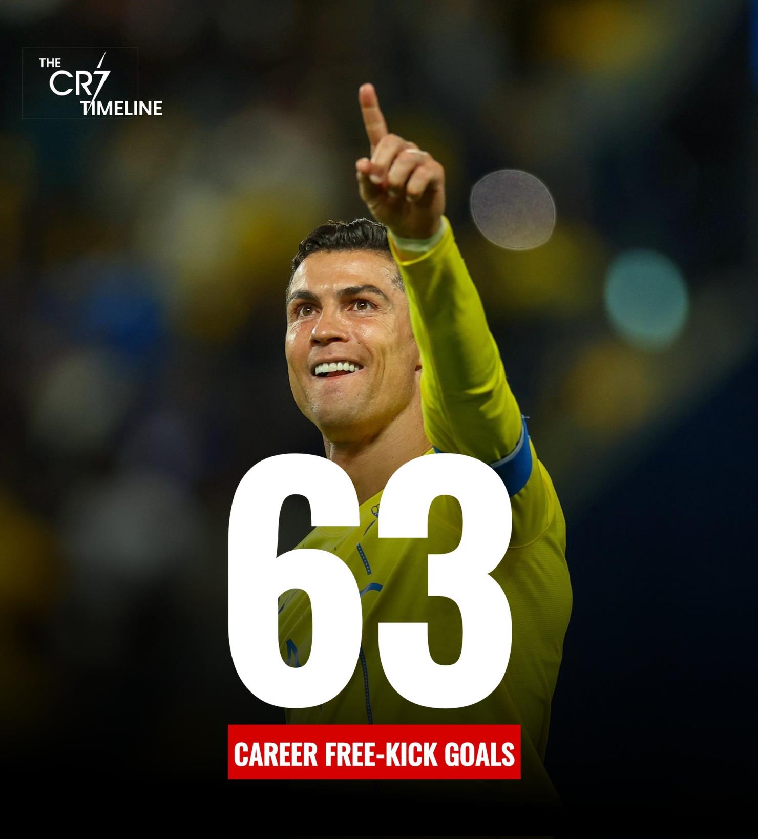 04月04日讯 利雅得胜利客场8-0狂胜艾卜哈,C罗打进两粒任意球,生涯任意球进球来到63个,超越马拉多纳排名历史第七。