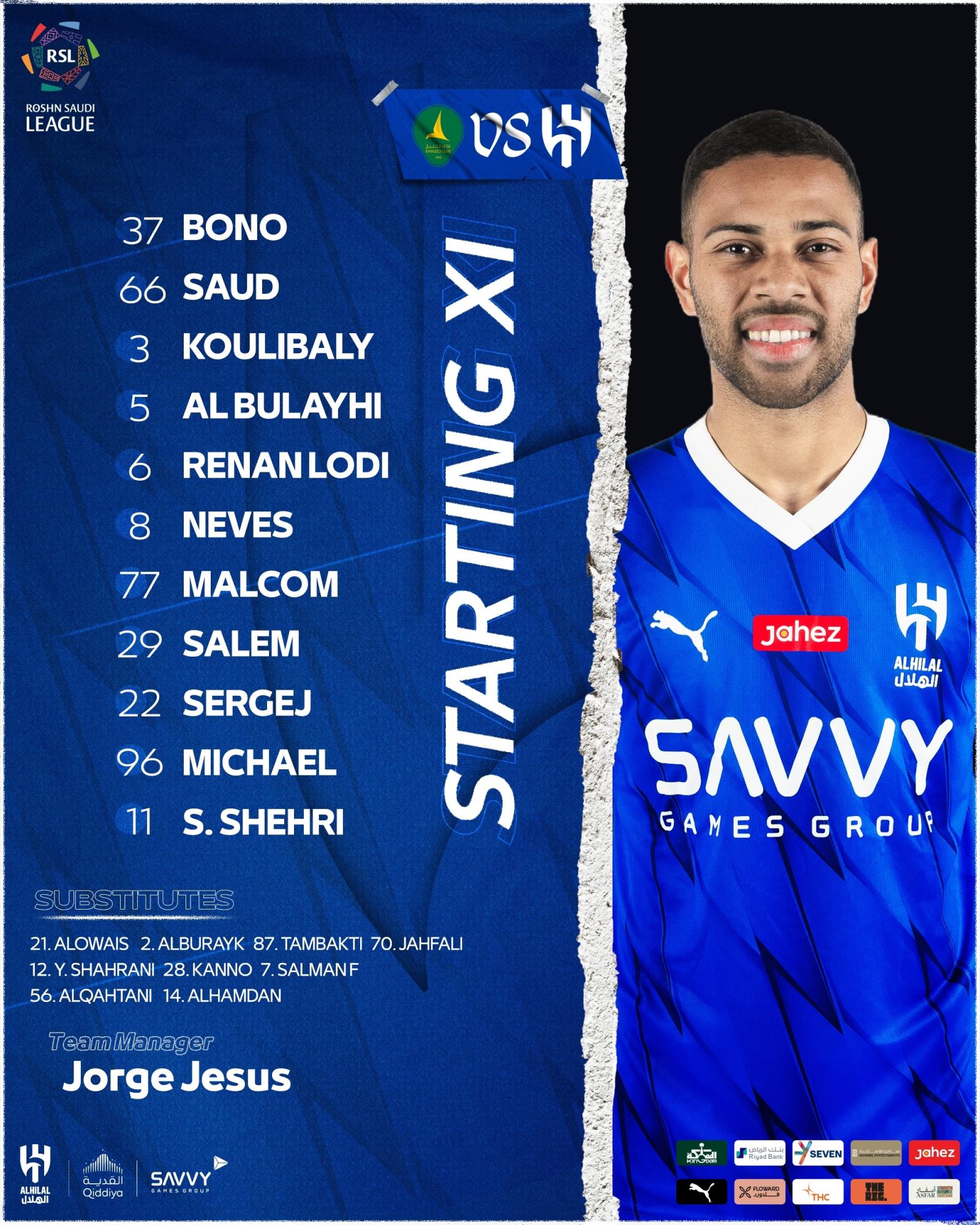 利雅得新月首发:37-布努、3-库利巴利、5-布莱希、66-阿卜杜勒哈米德、6-洛迪、8-鲁本-内维斯、22-米林科维奇、11-谢赫里、29-萨勒姆-多萨里、77-马尔科姆、96-迈克尔