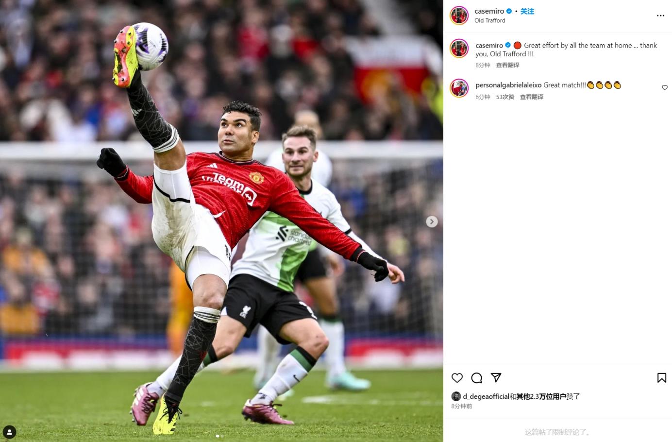 4月8日讯 曼联主场2-2战平利物浦,赛后,卡塞米罗在社媒发布动态。