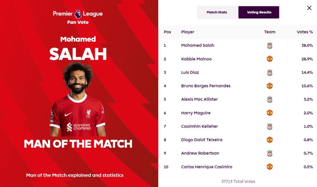 本场比赛,萨拉赫主罚点球命中,送出3脚关键传球,贡献1次解围。他获得了球迷38%的投票,当选全场最佳球员。排在第二的是18岁小将梅努,他获得了28.9%的投票,迪亚斯以14.4%的得票率位列第三。