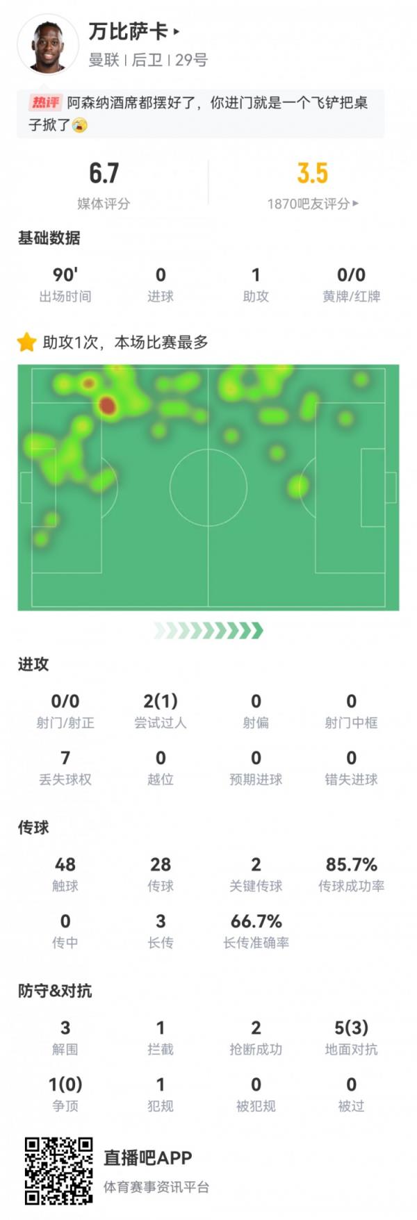 4月8日讯 本轮英超双红会,曼联2-2利物浦。此役万比萨卡在最后时刻鲁莽送点,球员全场重点数据如下↓