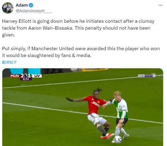 曼联博主质疑这次判罚:埃利奥特在接触万比萨卡前就开始倒地了,这个点球不应该给。