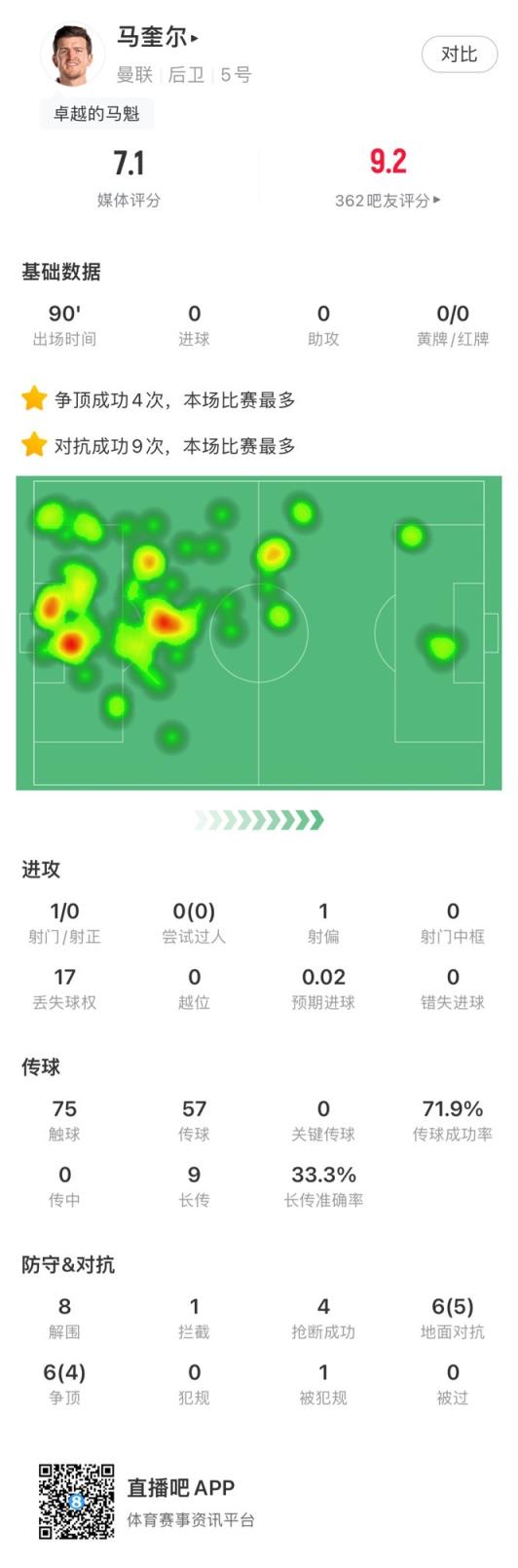 马奎尔本场比赛争顶成功4次&对抗成功9次均为全场最高。