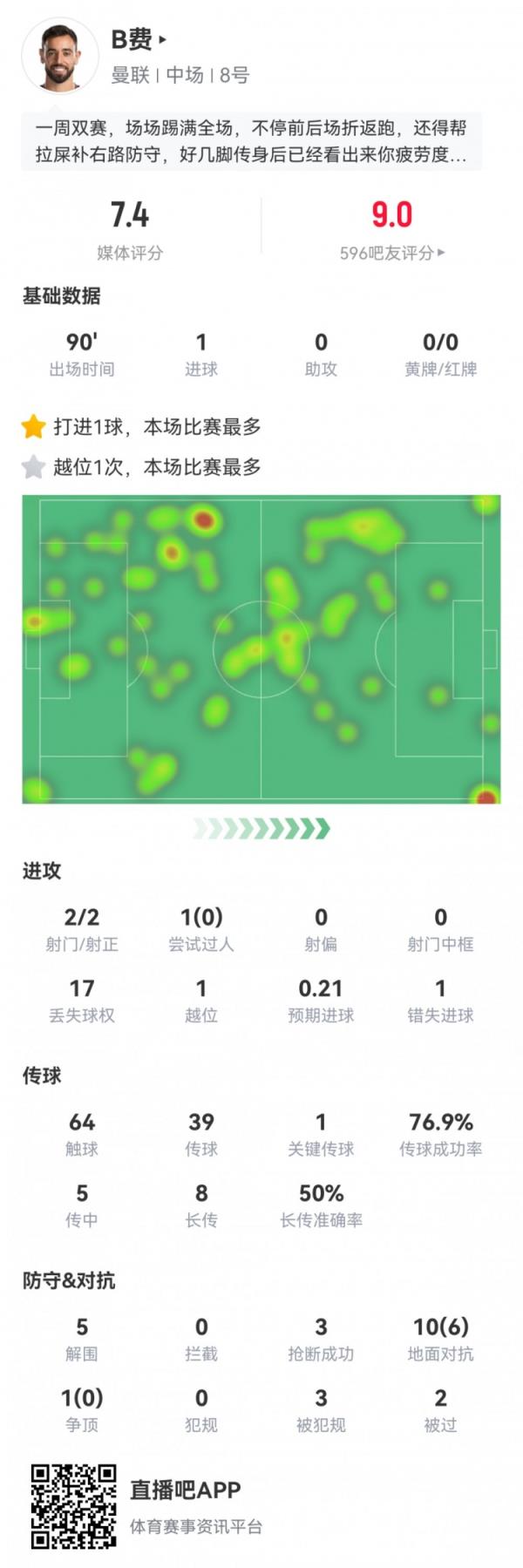 4月8日讯 本轮英超双红会,曼联2-2利物浦。B费首发打满全场,有一粒技惊四座的中圈吊射,球员全场重点数据如下↓