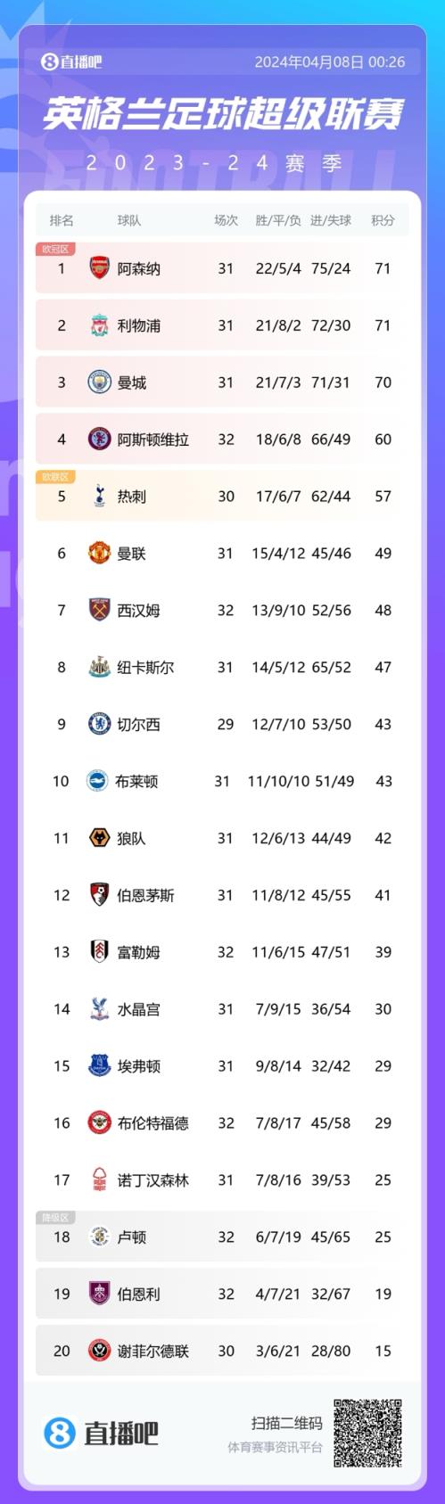 4月8日讯 英超第32轮双红会,曼联2-2利物浦。赛后积分榜形势如图。