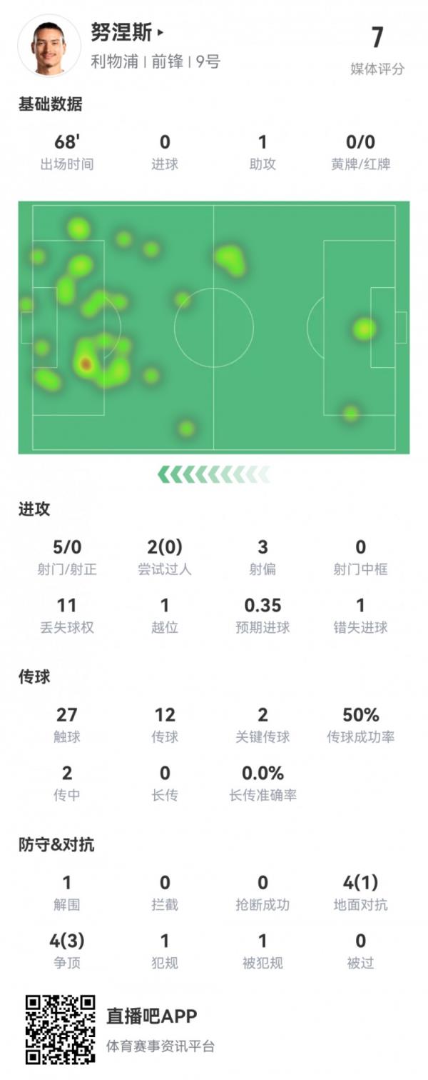 4月8日讯 本轮英超双红会,曼联2-2利物浦。努涅斯首发出战68分钟,球员全场重点数据如下↓