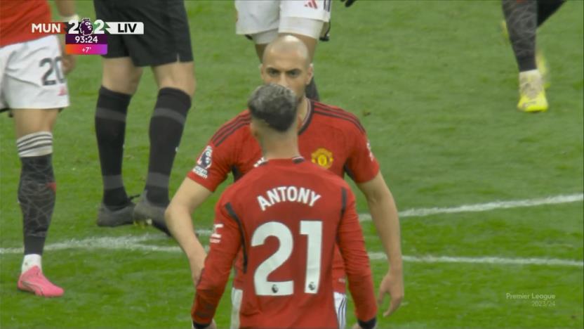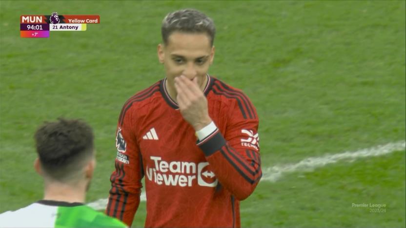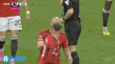 04月08日讯 英超第32轮,曼联vs利物浦。第93分钟,安东尼不满裁判判罚,嘴上不停地说着,阿姆拉巴特将他推开。字幕显示安东尼吃到了黄牌。