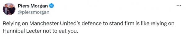 在梅努进球前5分钟,摩根刚刚在社媒吐槽:依靠曼联的后防线站稳脚跟,就像你希望汉尼拔别吃你。