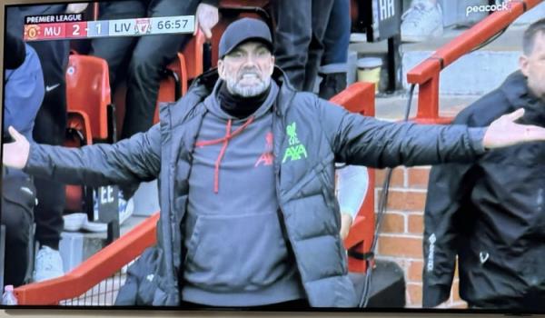 随后梅努破门,摩根晒出克洛普一脸懵的图,简单直接地写道:BOOOOOOOOOOM!!!