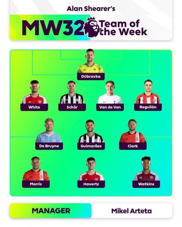 4月9日讯 英超第32轮比赛已经全部结束,阿兰-希勒评选出了本轮的最佳阵容,其中,德布劳内领衔,哈弗茨、吉马良斯、沃特金斯等人入选,阿尔特塔为最佳教练。
