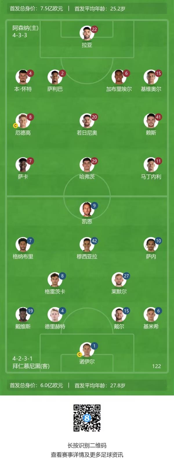 阿森纳首发:22-拉亚、4-本-怀特、2-萨利巴、6-加布里埃尔、15-基维奥尔、8-厄德高、20-若日尼奥、41-赖斯、7-萨卡、11-马丁内利、29-哈弗茨