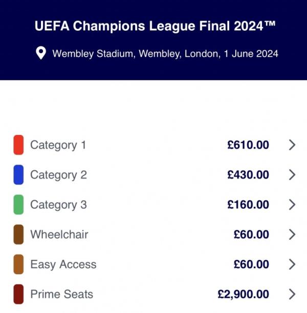 本赛季欧冠联赛已经进入到1/4决赛阶段,而欧冠决赛将于6月1日晚间在伦敦温布利球场进行,该场比赛的门票信息公布。