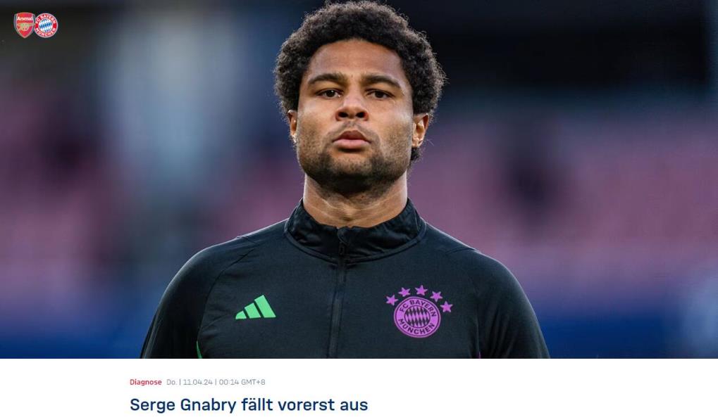拜仁2-2战平阿森纳的比赛,格纳布里下半场伤退。据此前德天空消息,格纳布里预计缺阵2-3周。