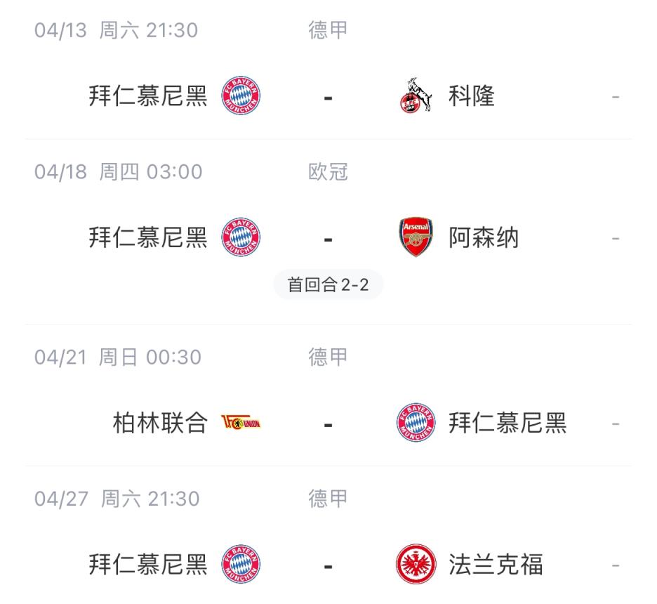 拜仁本周六德甲将对阵科隆,与阿森纳的次回合比赛则是4月18日。