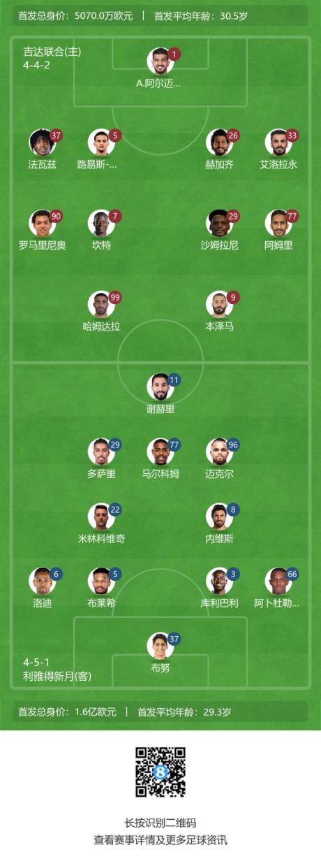 吉达联合首发:1-马约夫、5-路易斯-费利佩、26-赫加齐、33-奥拉扬、37-法瓦斯-斯库尔、7-坎特、29-沙姆拉尼、77-阿姆里、90-罗马里尼奥、99-哈姆达拉、9-本泽马