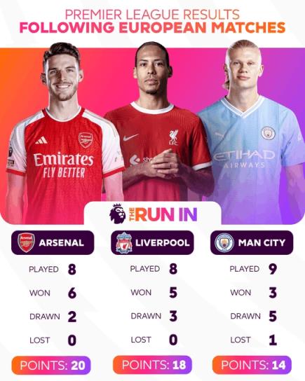04月13日讯 欧战比赛结束,英超官方统计了争冠三队欧战后的联赛表现,阿森纳、利物浦皆不败,曼城胜率只有1/3。