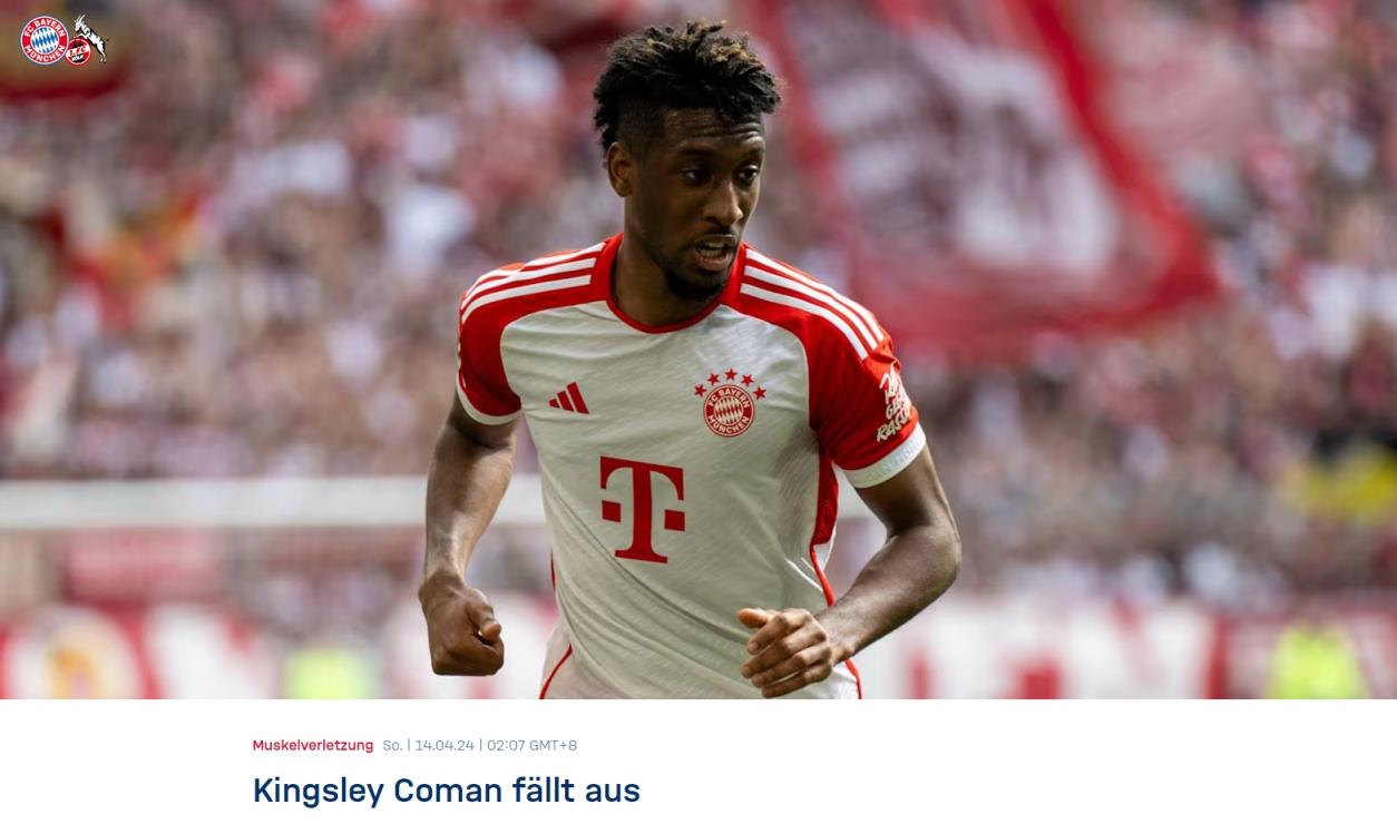 04月14日讯 拜仁官方消息,科曼在对阵科隆的比赛期间受伤,球员经检查后确认为右内收肌受伤,将缺阵数周时间。