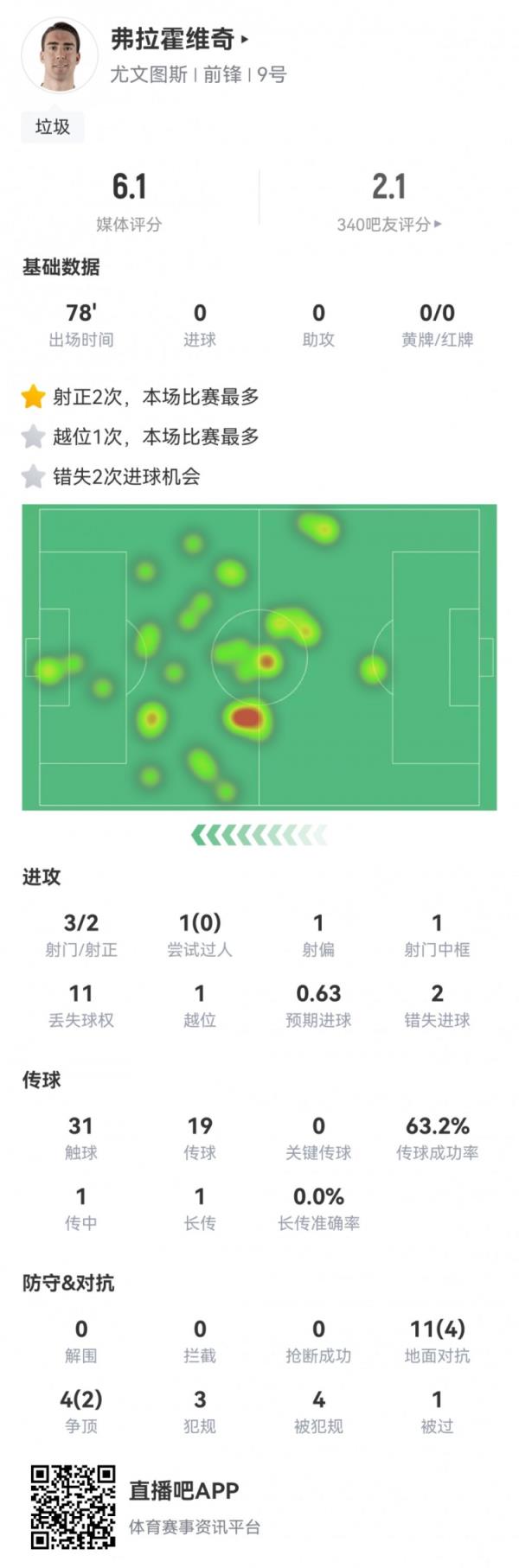 4月14日讯 本轮意甲,尤文客场0-0战平都灵。此役弗拉霍维奇发挥不佳,球员全场重点数据如下↓