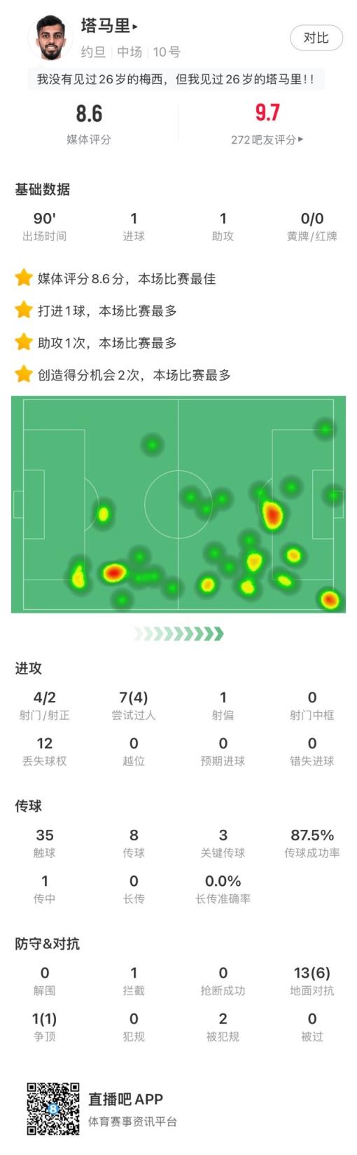 2月7日讯 亚洲杯半决赛,约旦2-0韩国晋级决赛,约旦10号塔马里发挥出色,全场比赛贡献1球1助攻,获评全场最佳。球员全场重点数据如下↓