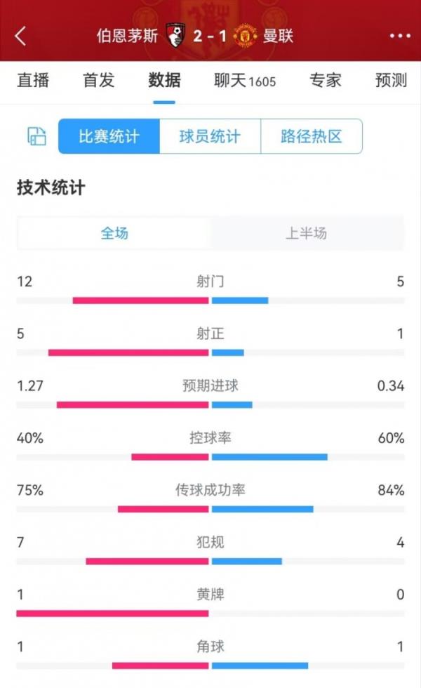 双方半场数据方面,曼联控球率60%-40%占优,但射门数和射正数均远远落后。