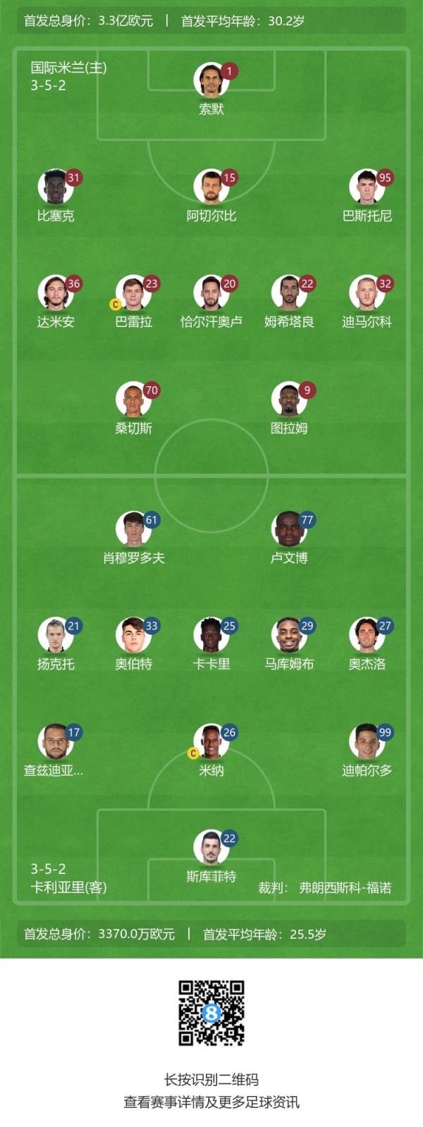 国米首发:1-索默、31-比塞克、15-阿切尔比、95-巴斯托尼、36-达米安、23-巴雷拉、20-恰尔汗奥卢、22-姆希塔良、32-迪马尔科、9-图拉姆、70-桑切斯