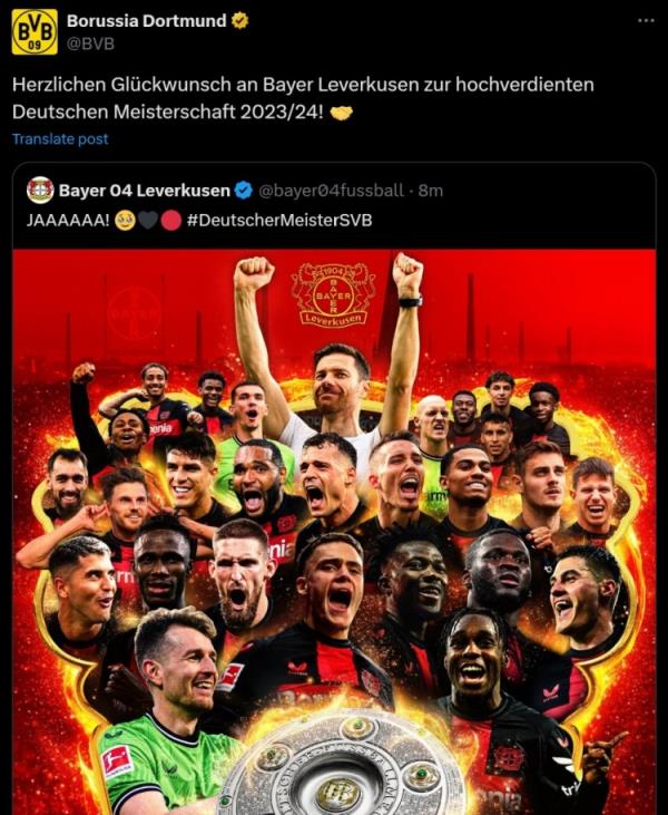 多特官推写道:恭喜勒沃库森夺得2023-24赛季德甲冠军,实至名归!