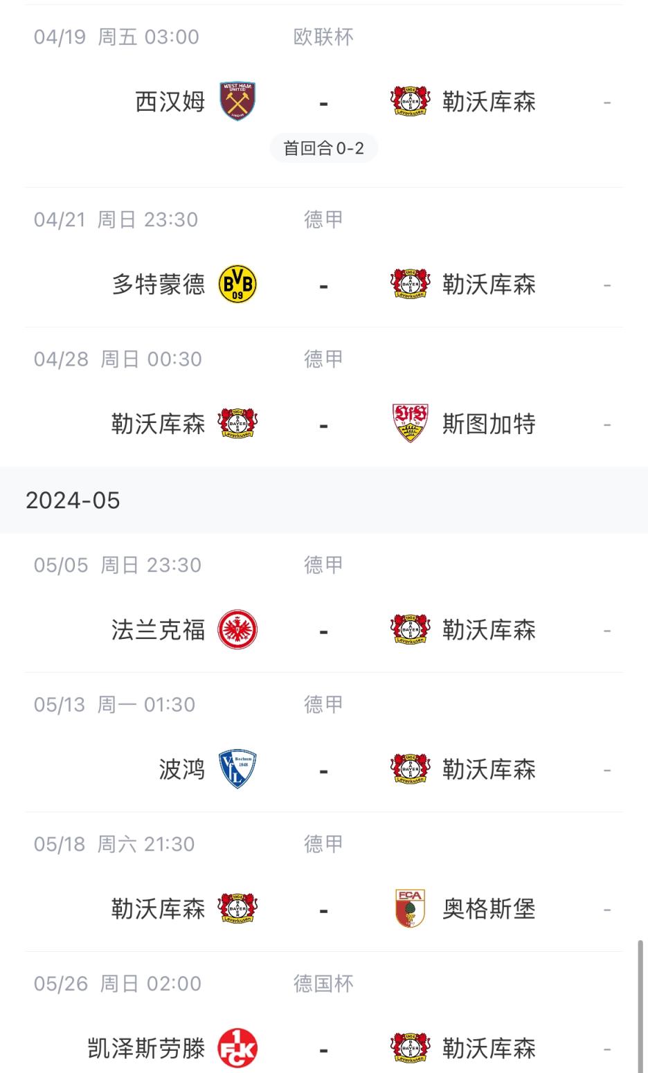 本赛季德甲还剩五轮,勒沃库森的对手分别是多特、斯图加特、法兰克福、波鸿、奥格斯堡。