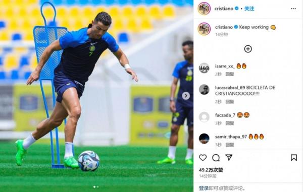 C罗也在社交媒体上晒出了训练照,照片中,C罗大腿肌肉线条瞩目,神情也十分专注。C罗配文:继续努力