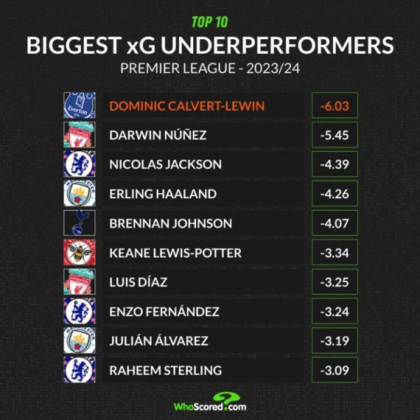 4月16日讯 根据WhoScored的统计,本赛季英超实际进球与预期进球相差最大的球员为勒温,努涅斯、杰克逊、哈兰德分列第二至第四位。