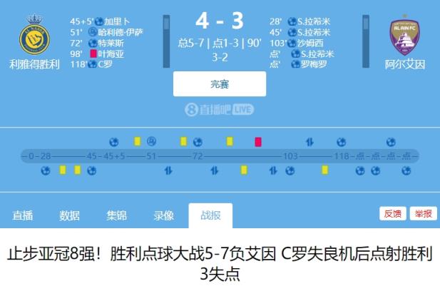 目前阿尔艾因在亚冠赛场已经连克两支利雅得球队:1/4决赛,阿尔艾因点球大战击败利雅得胜利,C罗首次亚冠之旅就此止步;本场半决赛首回合,阿尔艾因又胜利雅得新月,次回合他们将做客新月主场。