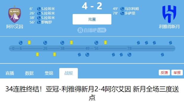 4月18日讯 亚冠半决赛首回合,阿尔艾因主场4-2击败利雅得新月,终结对手34连胜!