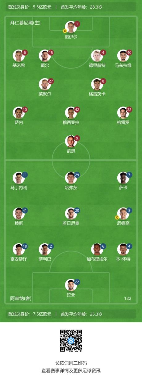 拜仁vs阿森纳:拜仁首发身价5.3亿欧,阿森纳首发身价7.5亿欧