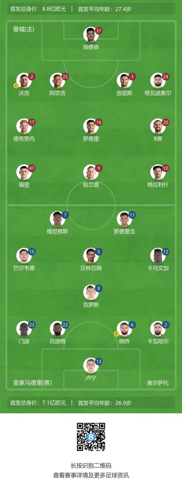 曼城vs皇马:曼城首发8.8亿欧身价,皇马首发身价7.1亿欧