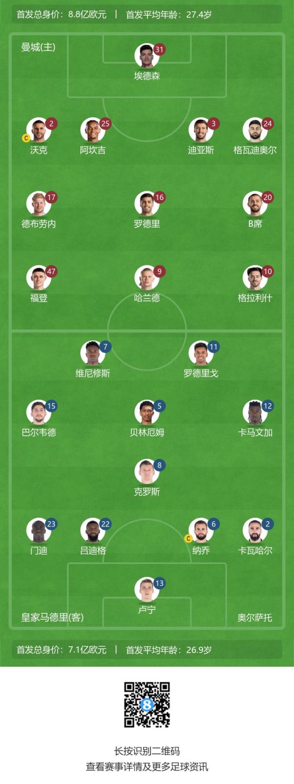 曼城首发:31-埃德森、2-沃克、3-迪亚斯、25-阿坎吉、24-格瓦迪奥尔、16-罗德里、17-德布劳内、47-福登、20-B席、9-哈兰德、10-格拉利什