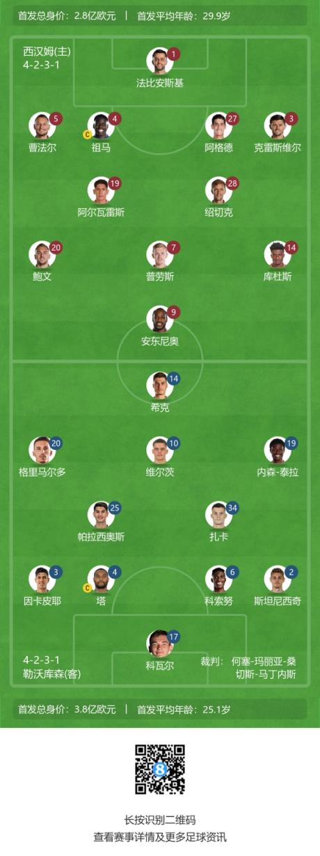 西汉姆首发:1-法比安斯基、4-祖马、27-阿格德、5-曹法尔、3-克雷斯维尔、7-沃德-普劳斯、19-埃德森-阿尔瓦雷斯、28-绍切克、20-鲍文、14-库杜斯、9-安东尼奥